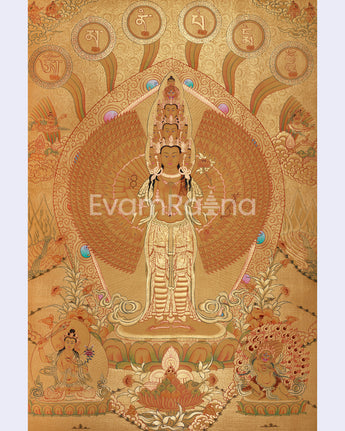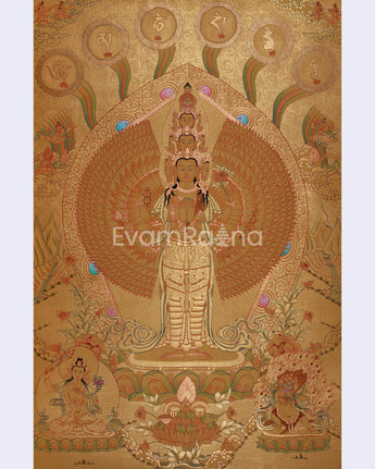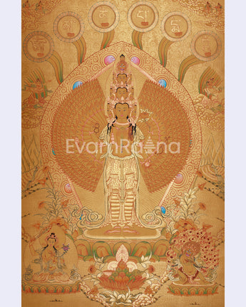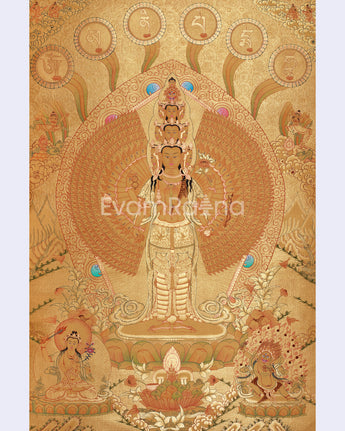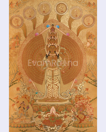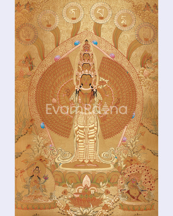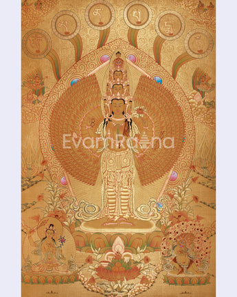 Avalokiteshvara in Gold with Mantra and Deities | Sacred Compassion Art