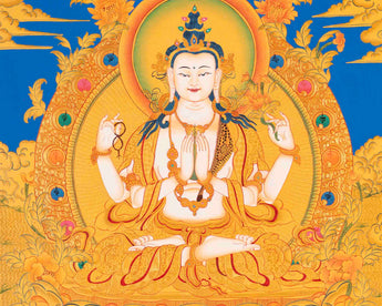 Chenrezig is gracefully seated in meditation posture surrounded by fully bloomed flowers in this four-armed Avalokiteshvara thangka print. This high-quality bodhisattva art portrays Chenresig folding his two hands in a devotional gesture. The upper right hand holds the never-ending cycle, akashamala, and his upper left-hand holds a white lotus.