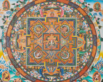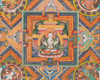 This Chnerezig Mandala Thangka is a sacred Tibetan Buddhist painting that intricately portrays Chenrezig seated in meditation, surrounded by an enchanting mandala, a geometric design representing the universe's cosmic order.