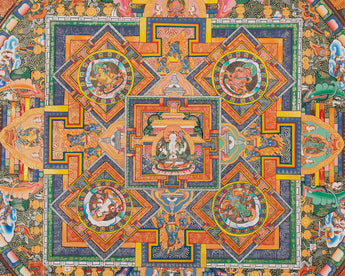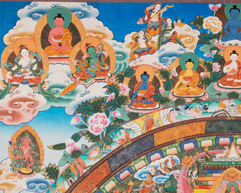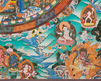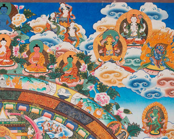 Our Big 4 Armed Chenrezig Mandala Thangka is a masterpiece that beautifully encapsulates the essence of compassion and spiritual transcendence. Chenrezig, also known as Avalokiteshvara, is a revered bodhisattva in Tibetan Buddhism, embodying boundless compassion and mercy. With four arms symbolizing active compassion, Chenrezig extends blessings to all sentient beings.