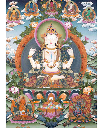 Big Size 4 Armed Chenrezig Thangka | Surrounded by 5 Buddhas, Manjushri and Vajrapani |