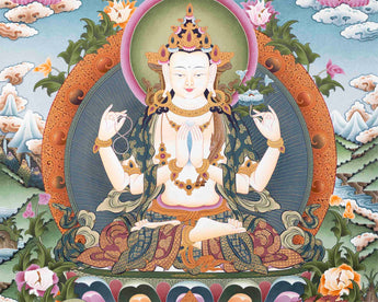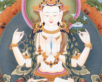 Set out on a compassionate path with our "Big Size 4 Armed Chenrezig Thangka," an exquisite piece surrounded by the enlightened presence of Manjushri, Vajrapani, and the Five Buddhas. Chenrezig, also known as Avalokiteshvara, is a highly cherished bodhisattva symbolizing boundless compassion in Tibetan Buddhism. This Thangka beautifully depicts Chenrezig with four arms, each holding a symbol of his qualities: a wish-fulfilling jewel, a lotus flower, a rosary, and a gesture of blessing.