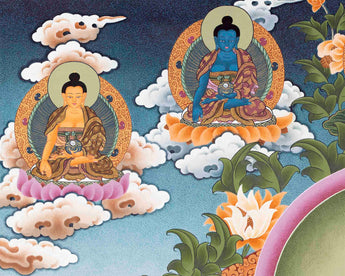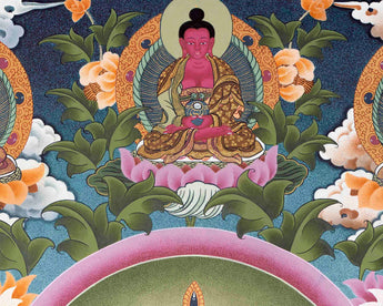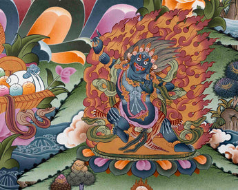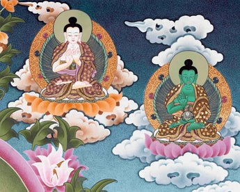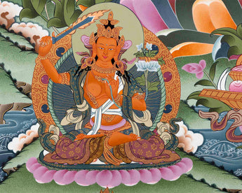 The surrounding deities—Manjushri representing wisdom, Vajrapani symbolizing power, and the Five Buddhas embodying various enlightened qualities—enhance the Thangka’s spiritual significance. Together, they represent the integration of compassion, wisdom, and strength necessary for overcoming obstacles on the spiritual path.