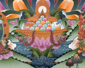 Displaying this large Chenrezig Thangka in your sacred space invites a profound visual exploration of compassion. It encourages practitioners to connect deeply with Chenrezig's transformative energy, cultivating compassion and seeking refuge in the enlightened beings depicted. This artwork not only enhances the aesthetic beauty of your meditation area but also infuses your spiritual practice with the blessings and guidance of Chenrezig, the Five Buddhas, and the bodhisattvas.