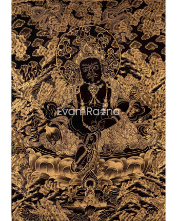 Dzambala, also known as Jambhala, is a deity revered in Tibetan Buddhism as the god of wealth and abundance. He is depicted as a golden figure seated on a lotus throne, holding a mongoose in his left hand and a citron fruit or a jewel-spouting mongoose in his right hand. Dzambala is believed to possess the power to bestow material wealth, prosperity, and abundance upon his devotees, as well as to remove obstacles to their financial well-being. According to Buddhist mythology, Dzambala emerged from the pristine waters of the Cintamani Lake, also known as the Wish-Fulfilling Jewel. He is considered to be an emanation of the Bodhisattva Avalokiteshvara, embodying compassion and generosity. Devotees of Dzambala often engage in rituals and prayers to invoke his blessings and seek his assistance in matters related to wealth, success, and prosperity. In Tibetan Buddhist tradition, Dzambala is one of the Five Wealth Deities, each associated with different aspects of wealth and abundance. He is particularly revered among traders, merchants, and individuals seeking financial stability and prosperity.