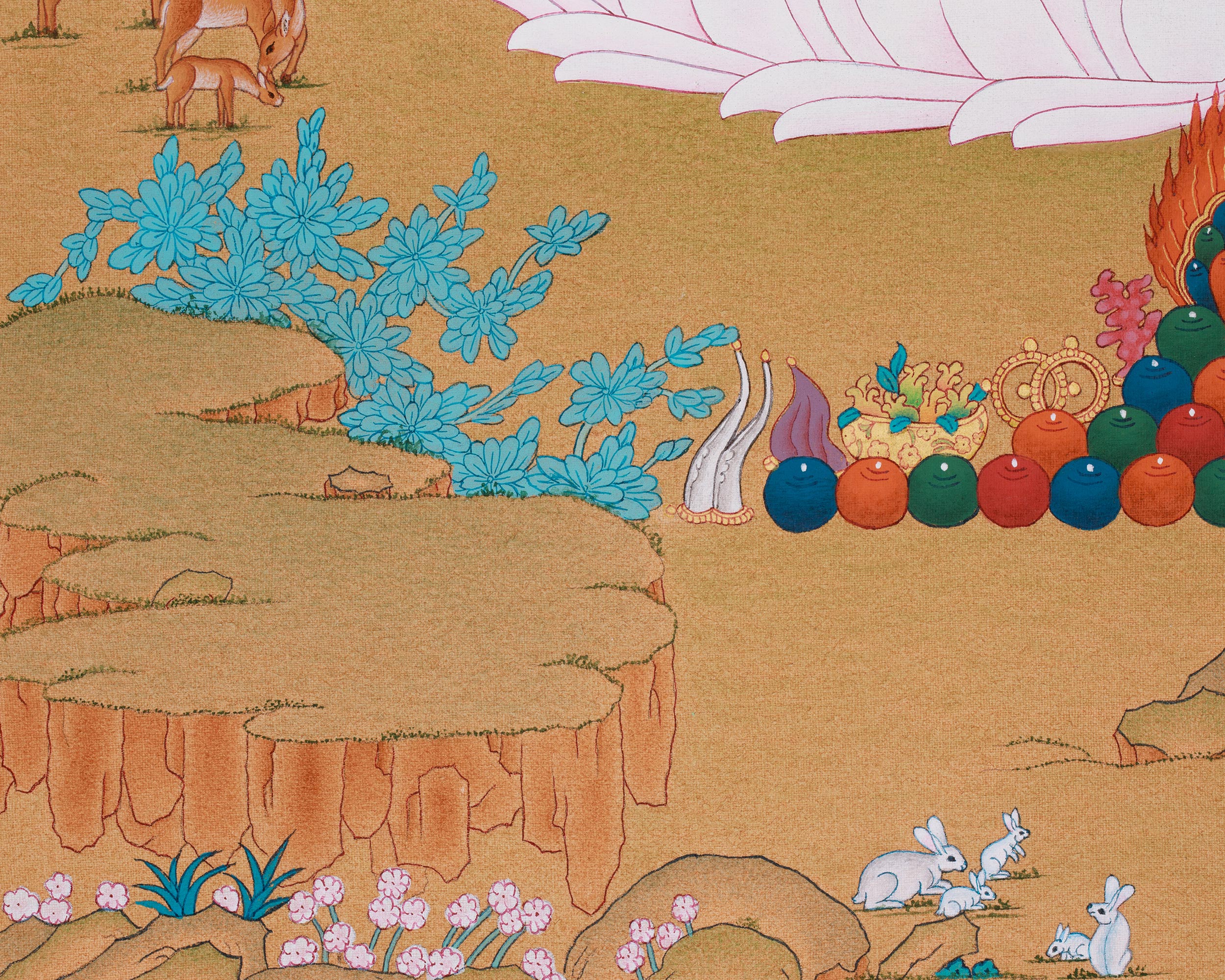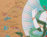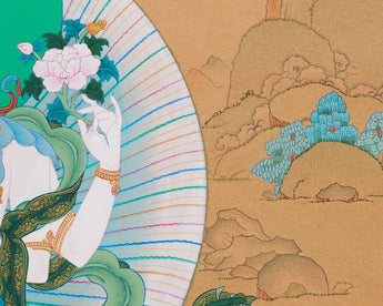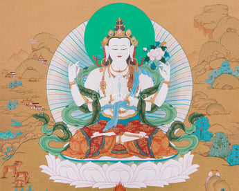 At the center of this thangka, Chenrezig (Avalokiteshvara)—the Bodhisattva of Infinite Compassion—sits on a blooming lotus, radiating calm benevolence. With four arms, he holds a wish-fulfilling jewel near his heart, a lotus flower in one hand, and a mala in the other, representing his ceaseless vow to help all beings escape suffering. The peaceful background depicts a sacred landscape with gentle deer, a rabbit, birds, and a divine Nagar Kanya emerging from the waters with offering gestures. In the distance, a modest stupa and Tibetan houses appear softly amidst rolling clouds, symbolizing wisdom, community, and the enlightened journey. Every element contributes to this world of harmony and compassion.