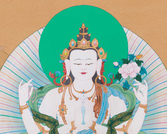 Bathed in an aura of serenity and light, this Bodhisattva Chenrezig painting truly embodies compassion and sacred artistry. Skillfully created on pure cotton canvas at our Enlightenment Studio, this thangka beautifully combines natural stone pigments with dazzling 24K gold. Each layer of mineral color offers vibrant, lasting beauty and spiritual depth, while the gold details add a radiant glow to every curve and contour. Made in the traditional Karma Gadri style, it perfectly captures both precision and spaciousness—reflecting the endless compassion of Avalokiteshvara.