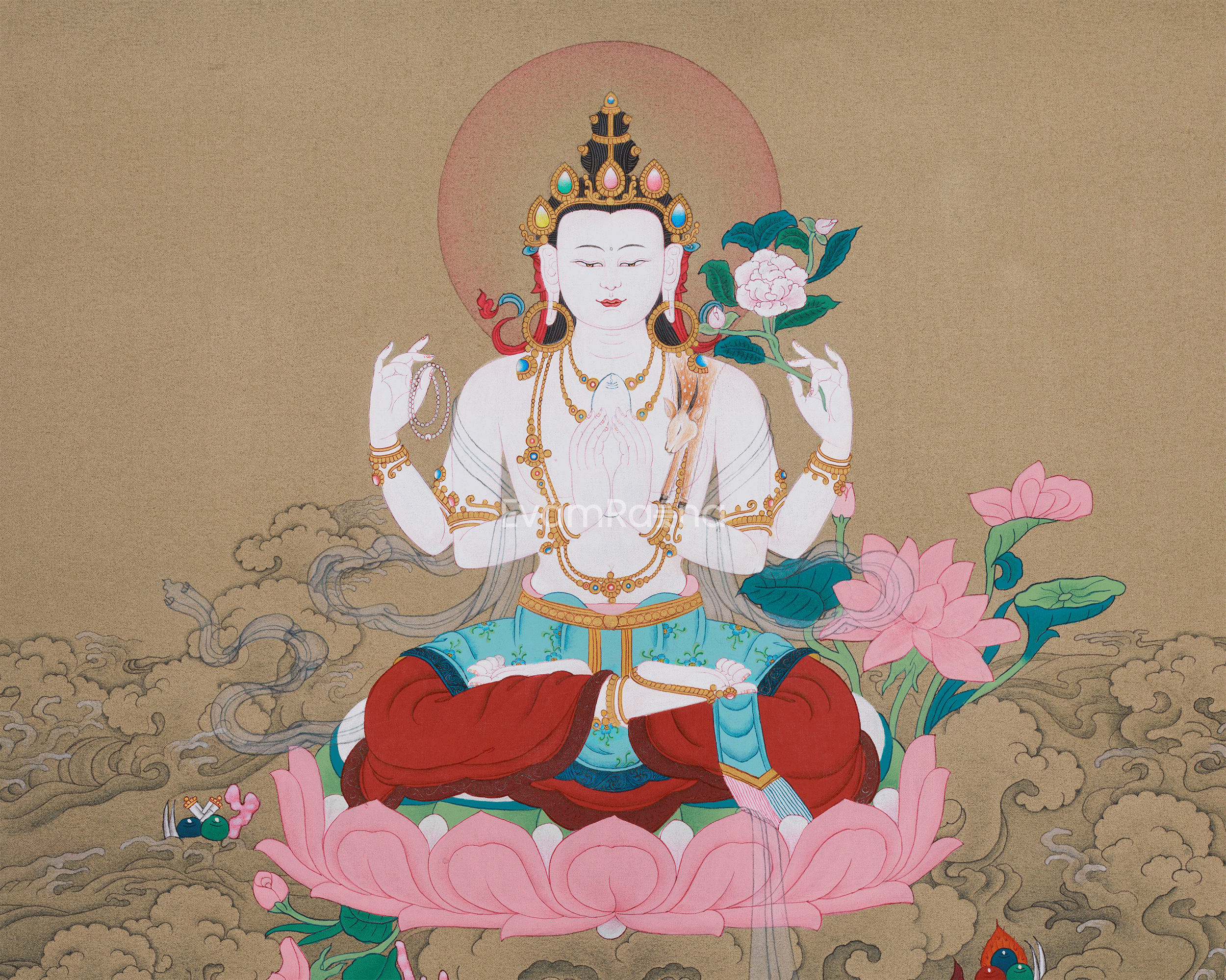 Chenrezig, also known as Avalokiteshvara, is one of the most revered figures in Tibetan Buddhism. He embodies the essence of infinite compassion, seeing and alleviating the suffering of all beings. In this thangka, Chenrezig is depicted with four arms, each symbolizing his boundless ability to reach out and help those in need. His serene expression and graceful posture highlight his wisdom, compassion, and commitment to guiding all beings toward enlightenment. This thangka is not only an exquisite work of art but also a powerful spiritual tool, inviting the compassionate energy of Chenrezig into your home or meditation space.