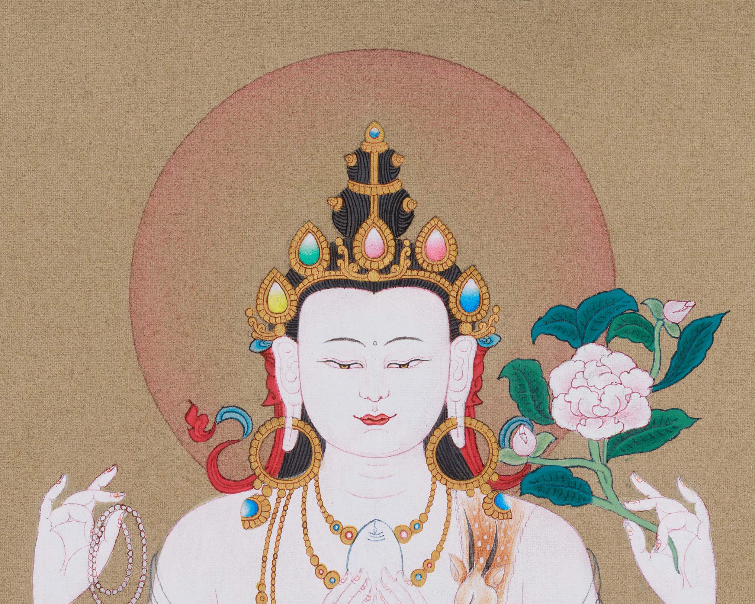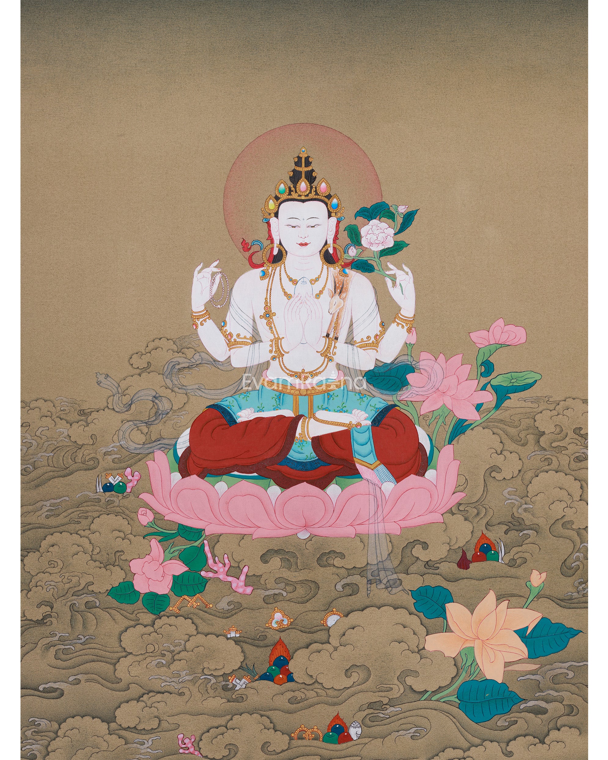 The Boundless Compassion Chenrezig Thangka is a beautifully hand-painted acrylic work on high-quality cotton canvas, featuring genuine 24K gold. Made in the traditional Karma Gadri style, it captures the peaceful and compassionate essence of Chenrezig, the Bodhisattva of Compassion. The bright colors and fine gold accents amplify its divine energy, making it both a spiritual work of art and a radiant symbol of healing and tranquility. Every detail is meticulously created to reflect Chenrezig's infinite compassion, inviting his protective and healing presence into your space.