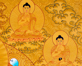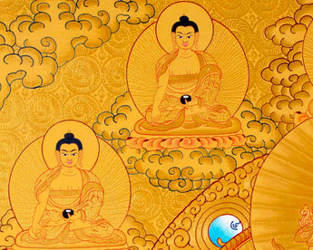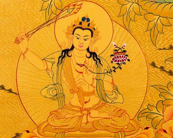 Chengrezig Avalokitesvara Hand-painted 24k Gold Style Thangka- Flanked by Boddhisattvas Vajrapani and Manjushree