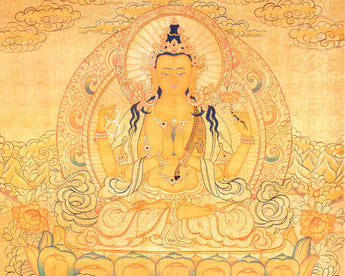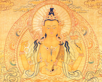 Chengrezig Avalokitesvara Hand-painted 24k Gold Style Thangka Flanked by Vajrapani & Manjushree