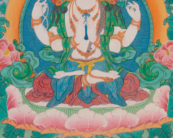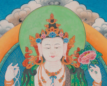 Chenrezig is represented with four arms, which represent his capacity to reach out and aid all sentient beings. His two middle hands carry a wish-fulfilling jewel at his heart, symbolizing the power of compassion, while his other hands hold a crystal mala, indicating constant prayer, and a lotus flower, symbolizing purity and enlightenment. His peaceful appearance, flowing robes, and celestial halo all have bright details that perfectly convey the Bodhisattva's divine essence.