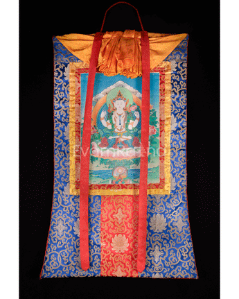 Brocade Mounted Thangka of 4 Armed Chenrezig Bodhisattva of Great Compassion