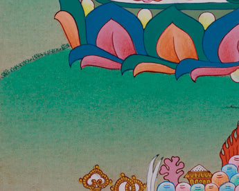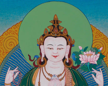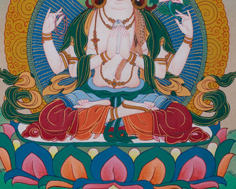 This thangka is a beautiful representation of Chenrezig, the Compassion Bodhisattva in Tibetan Buddhism, symbolizing infinite compassion. He is also known as Avalokiteshvara; he is revered for his vow to delay his own Buddhahood until all beings are free from suffering. The artwork is meticulously hand-painted in the traditional Karma Gadri style, using acrylic colors and 24K gold for divine accents. The gold detailing highlights the crown, jewelry, and sacred symbols, enhancing the spiritual ambiance of any space.
