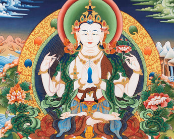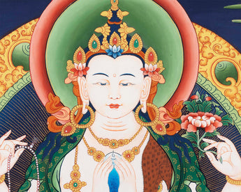 Chenrezig~He is white in colour, four armed carrying rosary in the right hand and full blown lotus in left. The other two principal hands are raised to the chest with the palms enjoined in Namaskar Mudra holding a round object known as “jewel” which is regarded as a symbol knowledge.