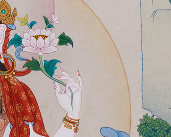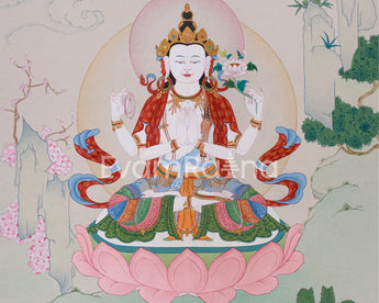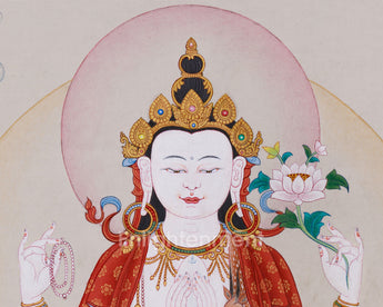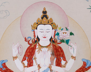 The Compassion Buddha Chenrezig, known as the Bodhisattva of boundless love and mercy, appears elegantly on this cotton canvas artwork. Hand-painted with acrylic colors and genuine 24K gold in the traditional Karma Gadri style, it features a perfect blend of soft textures and radiant embellishments. The gentle glitter of gold, when contrasted with the canvas's natural texture, creates a visual feast that transforms any space into a peaceful refuge.