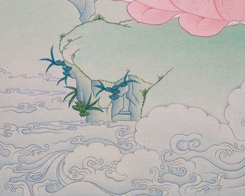 The elegant patterns and subtle shading showcase the elaborate detailing of his flowing robe, which is embellished with gold accents that glitter against the brilliant acrylic hues. The bright energy around him strengthens his spiritual presence, and the lotus throne he sits on represents purity emerging from adversity. More than just a work of art, it is a powerful spiritual tool that promotes inner serenity and is a timeless addition to any sacred area.