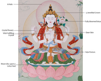 Chenrezig sits gracefully with four arms, emanating a compassionate radiance that embraces the viewer in a tranquil aura. His kind gaze conveys a comforting presence, offering solace and inspiration to the soul. The upper right hand holds a crystal rosary, indicating unending devotion and the path to enlightenment, while the top left holds a fully bloomed lotus, representing purity and spiritual awakening. His primary hands are wrapped in Anjali Mudra, holding a wish-fulfilling crystal, which represents unbounded compassion and the fulfillment of desires. A deer skin draped over his shoulder represents his pledge not to harm any living life, providing dimension to his tranquil and beneficent portrayal.