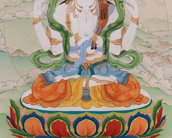 A Four-Armed Avalokiteshvara, a revered deity in Tibetan Buddhism, symbolizes infinite compassion and mercy. He is recognized as the embodiment of the compassion of all Buddhas, guiding sentient beings on their path to enlightenment. This exquisite thangka is hand-painted using natural stone colors on high-quality cotton canvas, featuring elegant gold accents.