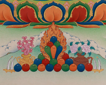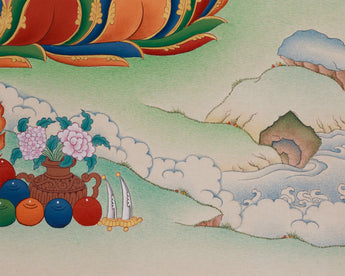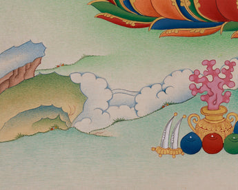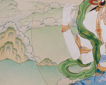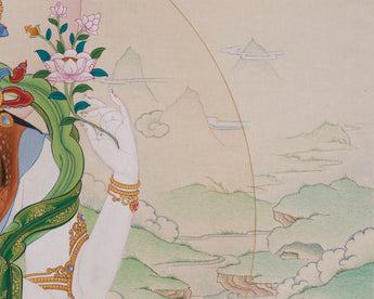 The painting follows the traditional Karma Gadri style, which is characterized by its spacious composition, soft colors, and harmonious landscapes. It enhances the deity's peaceful presence with flowing lines and balanced elements. The natural stone colors are meticulously layered, while gold detailing adds divine radiance to the crown, ornaments, and symbolic attributes. Skilled Nepali artists created this original painting from the Enlightenment Studio.