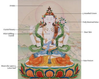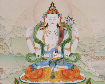 In this depiction, Avalokiteshvara sits serenely on a lotus throne, embodying a peaceful and compassionate presence. His front two hands are clasped in prayer, holding a wish-fulfilling crystal that symbolizes the unity of wisdom and compassion. The other two hands hold a crystal rosary and a blooming lotus, representing purity and the cycle of life. The deerskin over his shoulder signifies a gentle nature. The soft landscape in the background complements the deity's serene presence, exemplifying the Karma Gadri elegance.