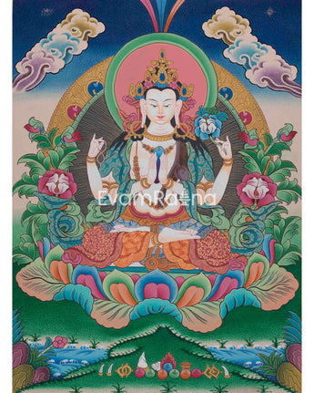 Four Armed Chengrezig Thangka | Original Hand-Painted Bodhisattva Artwork