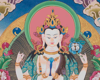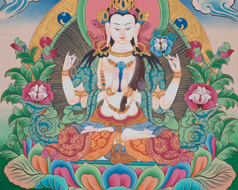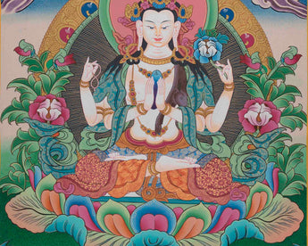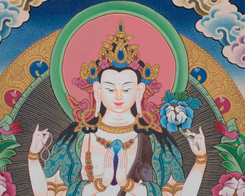 This Four-Armed Chenrezig Thangka is a traditional Tibetan Buddhist painting that depicts Chenrezig, the bodhisattva of compassion, known as Avalokiteshvara in Sanskrit. This thangka features Chenrezig with four arms, symbolizing his ability to aid sentient beings in all directions. He is shown with a serene expression, embodying boundless compassion. In his two upper hands, he holds a white lotus (Padma), representing purity and spiritual awakening, and a crystal mala (rosary), symbolizing his continuous recitation of mantras and dedication to the welfare of all beings. His lower right hand is in the varada mudra, the gesture of granting blessings, while his lower left-hand holds a wish-fulfilling jewel, symbolizing his compassion and ability to fulfill the wishes of those who seek his aid. Chenrezig is depicted seated on a lotus throne, surrounded by an aura of light and other symbolic elements like rainbows and celestial beings, enhancing the divine and compassionate atmosphere.