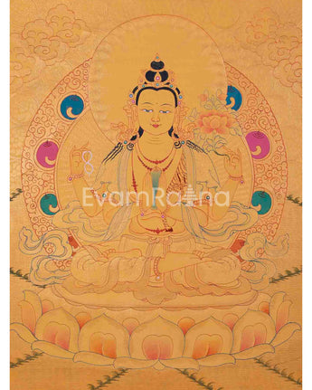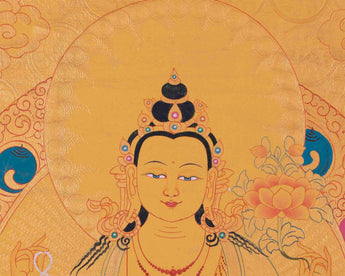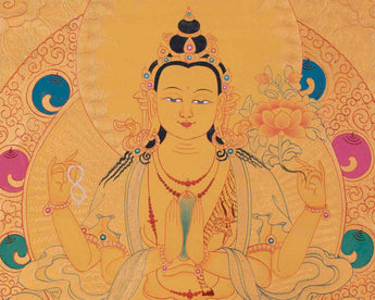 Avalokiteshvara Chenrezig, commonly known as Avalokiteshvara, is a Bodhisattva shown in the Chengrezig Thangka, a classic Tibetan Buddhist artwork. Avalokiteshvara is a highly regarded figure in many Buddhist traditions, as she is the embodiment of compassion. Generally shown in a sitting or standing position in the Thangka, Avalokiteshvara is adorned with a variety of symbolic objects including prayer beads and a lotus blossom. By acting as a center of attention for devotion and meditation, the Thangka enables practitioners to establish a connection with the loving attributes of Avalokiteshvara. For individuals following the Tibetan Buddhist tradition, the fine details, vivid colors, and distinctive iconography serve as a visual aid and a means of conveying spiritual teachings.