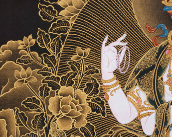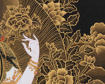 This thangka features Four-Armed Chenrezig Bodhisattva, meticulously hand-painted on high-quality cotton canvas with acrylic pigments and adorned with authentic 24K gold. Executed in the esteemed Nakthang (gold on black) style, it emanates a divine radiance as golden lines highlight the Bodhisattva against a profound black background. The detailed floral motifs, luminous lotus throne, and shimmering gold embellishments on his ornaments and robes collectively render this artwork a rare and esteemed spiritual masterpiece.