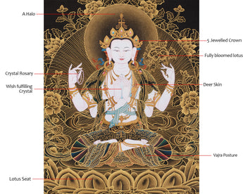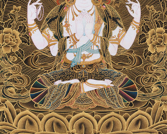 Chenrezig, also known as Avalokiteshvara, is a beloved Bodhisattva of Infinite Compassion in Tibetan Buddhism. In his four-armed form, he beautifully represents his endless ability to help all beings. His two main hands are gently joined in prayer at his heart, holding a precious wish-fulfilling jewel. His upper right hand holds a crystal rosary, symbolizing the ongoing flow of compassionate action. Meanwhile, his upper left hand carries a lotus flower, a symbol of purity and enlightenment. Tradition tells us that Chenrezig vowed never to rest until all beings are freed from suffering. When faced with the vastness of pain, his body was said to have shattered, only to be restored by Amitabha Buddha in this multi-armed, multi-eyed form. This sacred thangka beautifully captures his eternal vow to guide and support beings with compassion and wisdom.