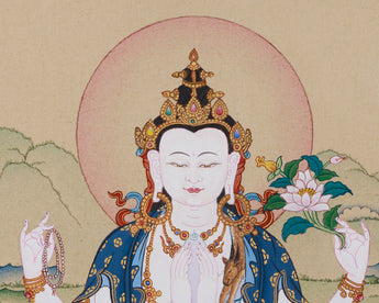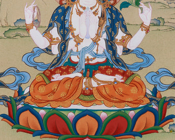 This Four-Armed Chenrezig Buddha Thangka is an artwork created on cotton canvas using 24K gold and natural stone colors. The natural stone colors deliver rich, vivid hues, while the gold accentuates the sacredness of this divine image. These carefully selected materials ensure the piece retains its color brilliance over time and embodies authenticity and spiritual meaning. The cotton canvas provides an excellent base for detailed designs, blending traditional craftsmanship with modern artistic methods.