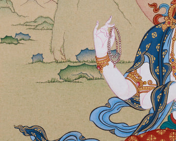 Chenrezig, also called Avalokiteshvara, is a revered figure in Tibetan Buddhism, symbolizing compassion and embodying the Buddha’s mercy. This Four-Armed Chenrezig Thangka shows the deity with four arms, symbolizing his boundless capacity to help beings in suffering. Painted in the traditional Karma Gadri style, this thangka captures Chenrezig’s calm and compassionate nature. His posture and facial expression exude peace and kindness, inviting all beings to seek refuge in his loving presence. The gold accents highlight his divine and compassionate qualities, making this thangka a powerful spiritual symbol in any sacred space.