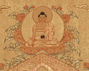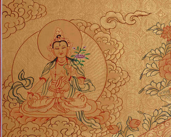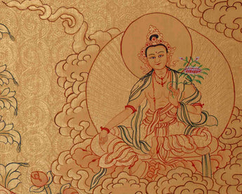 This Gold Style Lokeshvara thangka is a magnificent piece of Tibetan Buddhist art, featuring Lokeshvara (Avalokiteshvara), the bodhisattva of compassion, prominently in the center. Distinguished by its extensive use of gold, the thangka radiates a divine and luminous appearance. Lokeshvara is depicted in a serene and compassionate form, with multiple arms and heads, symbolizing his ability to reach out to all beings in need. Surrounding Lokeshvara are other significant deities: White Tara, Shakyamuni Buddha, Green Tara, Manjushri, and Vajrapani. White Tara, associated with compassion and longevity, is depicted with her characteristic white complexion and seven eyes, symbolizing her vigilance. Shakyamuni Buddha, the historical Buddha, is shown in a serene expression, sitting in the lotus position and making the earth-touching gesture (bhumisparsha mudra). Green Tara, known for her swift action and protection, is portrayed in a dynamic posture ready to respond to devotees' prayers. Manjushri, the bodhisattva of wisdom, holds a sword and a book, symbolizing the cutting of ignorance and the acquisition of pearls of wisdom. Vajrapani, the protector and guide of the Buddha, is shown wielding a vajra (thunderbolt), representing his power and determination. The gold background and accents highlight the divine nature of these figures, creating a luminous and sacred atmosphere. The deities' intricate detailing and vibrant colors contrast beautifully with the gold, enhancing the overall visual impact.