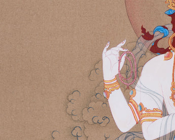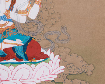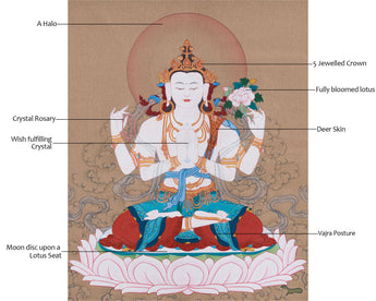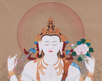 Chenrezig, known as the Bodhisattva of Compassion, is honored in Tibetan Buddhism for his boundless mercy and wisdom. This thangka depicts him with multiple arms, symbolizing his willingness to provide compassion in many forms to all sentient beings. His calm expression and peaceful stance reflect the core of infinite love and compassion. The elegant lotus seat and shimmering gold accents emphasize his purity and spiritual authority. At the same time, the detailed features, such as the crystal rosary and wish-fulfilling jewel, symbolize his dedication to the well-being of all beings. This beautiful thangka is not only a striking piece of art but also a spiritual instrument to evoke peace, wisdom, and compassion in any environment.