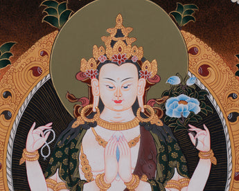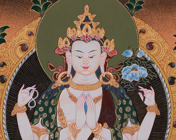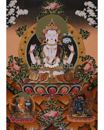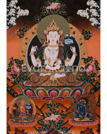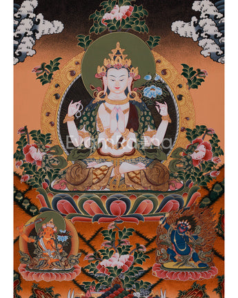 Hand-Painted Four Armed Chengrezig with Manjushri and Vajrapani | Tibetan Bodhisattva