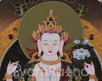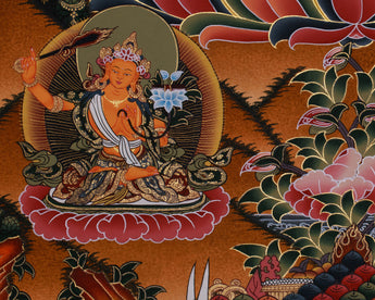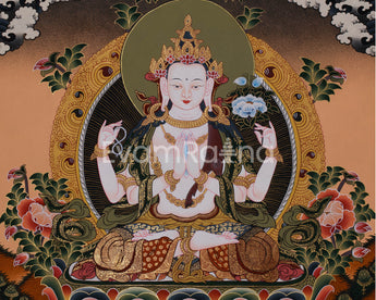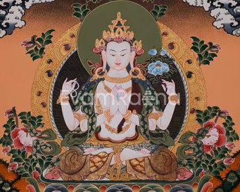 This hand-painted thangka of the Four-Armed Chengrezig, flanked by Manjushri and Vajrapani, is a striking depiction of Buddhist deities symbolizing compassion, wisdom, and power. Chengrezig, also known as Avalokiteshvara, is depicted with serene and compassionate features, holding a lotus flower, a prayer bead, and a vase containing immortality nectar. To Chengrezig’s right is Manjushri, the Bodhisattva of Wisdom, who holds a flaming sword to cut through ignorance and a lotus bearing the Prajnaparamita sutra, symbolizing wisdom. On his left is Vajrapani, the Bodhisattva of Power, who is depicted with a dynamic expression, holding a vajra, symbolizing the power to overcome obstacles and transform negative forces. The thangka's background is richly detailed with vibrant colors and intricate patterns, featuring auspicious symbols and celestial motifs. The meticulous brushwork and use of natural pigments demonstrate the artist's skill and dedication, making it a profound spiritual artifact.