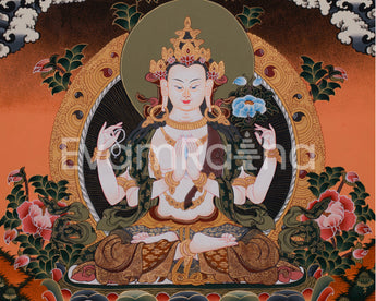 Hand-Painted Four Armed Chengrezig with Manjushri and Vajrapani: