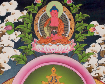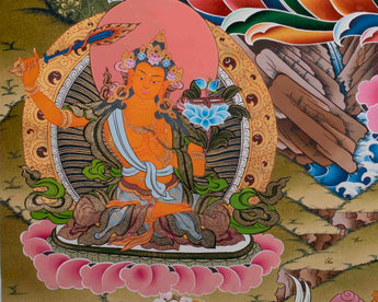 Above Chenrezig, Amitabha Buddha presides, symbolizing the ultimate enlightenment and wisdom. This positioning signifies the aspiration towards enlightenment that Chenrezig's compassion supports. Additionally, the inclusion of Manjushri and Vajrapani adds layers of meaning to the thangka. Manjushri, the embodiment of transcendent wisdom, and Vajrapani, the symbol of spiritual power and protector of the Dharma, complete this visual narrative of compassion, knowledge, and strength. This beautifully crafted thangka serves not only as a piece of art but also as a profound meditation focal point, guiding practitioners through the principles of Tibetan Buddhism with its rich symbolism and intricate details.