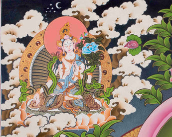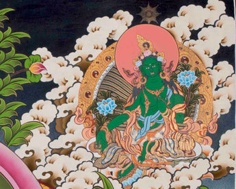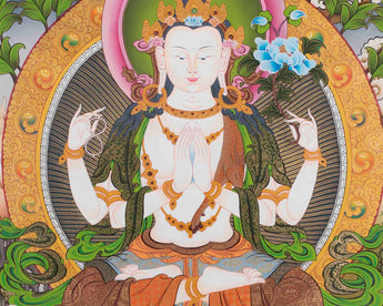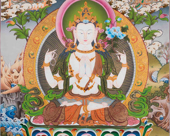 This Large-size 4-armed Chenrezig Thangka Painting is a stunning and intricate representation of Tibetan Buddhist art. Chenrezig, the embodiment of compassion, is depicted at the center with four arms, symbolizing his boundless ability to help all beings. Flanked by White Tara and Green Tara, this thangka brings forth the protective and nurturing aspects of these revered deities. White Tara is associated with longevity and healing, while Green Tara is known for her swift assistance and protection from fears. Together, they enhance the compassionate presence of Chenrezig, creating a powerful trio of divine support.