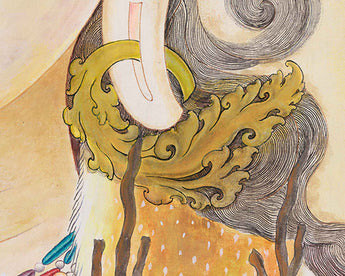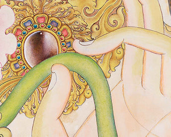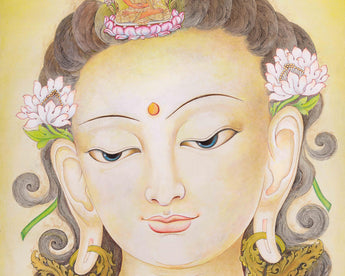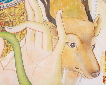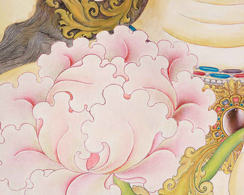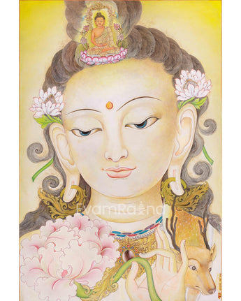 The Lokeshvara Chenresig Thangka holds a central place in Tibetan Buddhist art, portraying Lokeshvara, also known as Avalokiteshvara or Chenresig, the Bodhisattva of Compassion. This thangka, typically hand painted on canvas using traditional methods. Chenresig embodies boundless compassion and is revered as a divine being who hears the cries of all sentient beings and works tirelessly to alleviate their suffering. The Lokeshvara Chenresig Thangka serves as a focal point for meditation and devotion, inviting practitioners to connect with the Bodhisattva's compassionate energy and aspire towards embodying such qualities in their own lives. Through intricate details and vibrant colors, this sacred artwork not only captivates the eye but also serves as a potent reminder of the transformative power of compassion within the Tibetan Buddhist tradition.