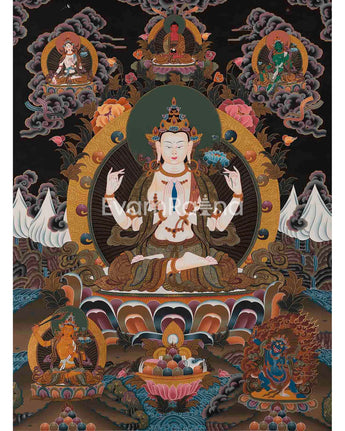 Original 4 Armed Chenrezig Thangka | Surrounded by Green Tara, White Tara, Manjushri, Amitabha Buddha, and Vajrapani |