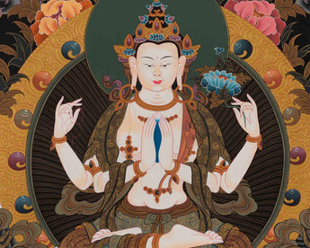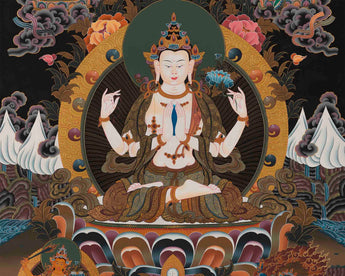 Chenrezig, also known as Avalokiteshvara, is a prominent figure in Tibetan Buddhism, embodying the compassion of all Buddhas. He is depicted with four arms, representing lovingkindness, compassion, joy, and equanimity. Chenrezig's hands are joined in prayer, holding a wish-fulfilling jewel, a crystal rosary, and a lotus flower. His compassionate presence is believed to alleviate suffering and help sentient beings on their spiritual path. He is revered as a bodhisattva who remains in the world to assist until all suffering has ceased, embodying the boundless compassion of the Buddha.
