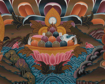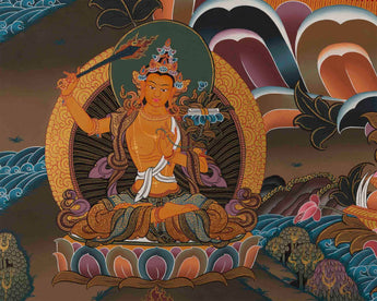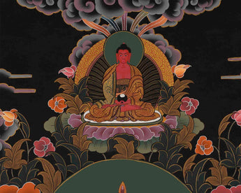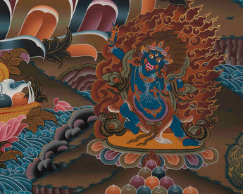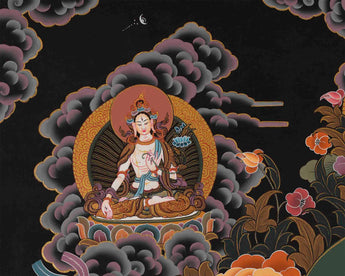 In this thangka, Four-Armed Chenrezig, surrounded by White Tara, Green Tara, Amitabha, Manjushri, and Vajrapani, symbolizes compassion, wisdom, and protection. Chenrezig embodies boundless compassion, while the Taras offer healing and swift assistance. Amitabha exudes serenity, Manjushri represents wisdom, and Vajrapani provides power and protection. Together, they form a powerful ensemble of virtues, inviting practitioners to invoke their blessings for spiritual growth and enlightenment.