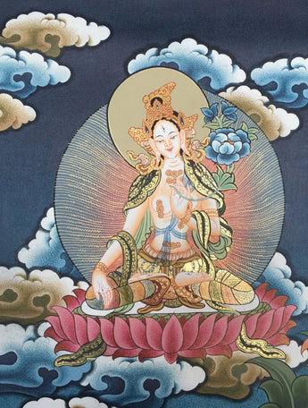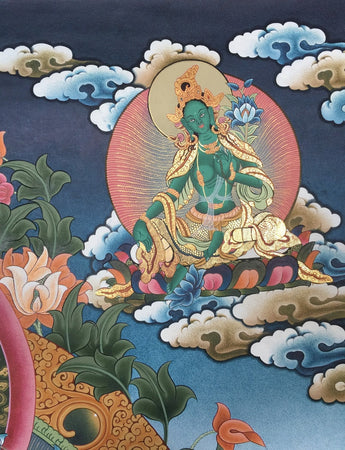 In this exquisite Thangka, the divine presence of Chenrezig (Avalokiteshvara) radiates at the heart of a spiritually rich tableau, embodying the boundless compassion that is central to Buddhist practice. As the focal point of the artwork, Chenrezig's serene and compassionate demeanor invites practitioners to connect deeply with their own capacity for empathy and altruism. Surrounding Chenrezig is a symphony of deities, each contributing unique qualities and virtues to the composition. White Tara, known for her healing and blessings of longevity, adds a layer of nurturing energy, ensuring the well-being and vitality of all who seek her guidance. Green Tara, with her swift and fearless assistance, symbolizes the immediate and compassionate action needed to overcome obstacles. Together, these deities create a rich, spiritual environment that encourages practitioners to cultivate these qualities in their own lives.