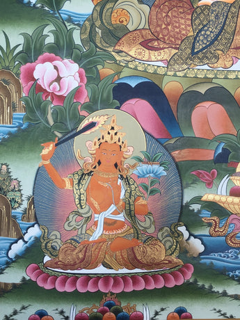 Complementing the compassionate deities, the Thangka also features figures that represent wisdom, protection, and the aspiration for a meaningful life. Dharmapalas, the fierce protective deities, stand vigilantly, ensuring the safety and spiritual integrity of the practitioners. Amitayus, the Buddha of Infinite Life, symbolizes the wish for a life filled with purpose and spiritual fulfillment. Manjushri, the embodiment of wisdom, offers the insight necessary to navigate the spiritual path. This harmonious composition not only highlights the interconnectedness of compassion, wisdom, and protection but also serves as a visual and spiritual guide for practitioners. By meditating on this Thangka, individuals are inspired to integrate these virtues into their daily lives, fostering a deeper spiritual awakening and a commitment to alleviating the suffering of all beings.