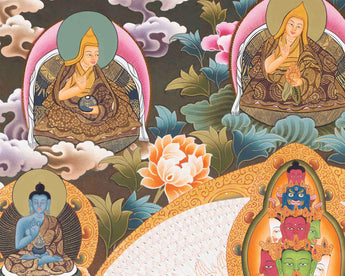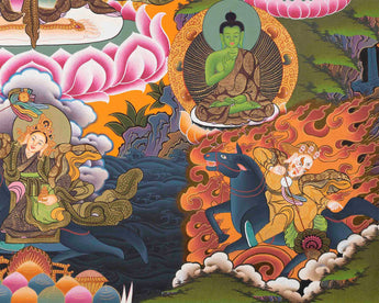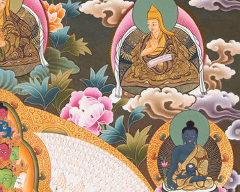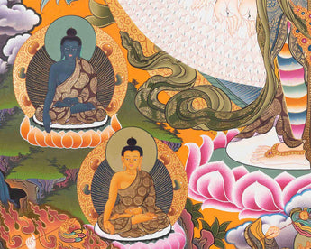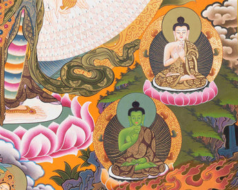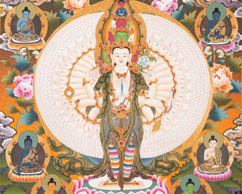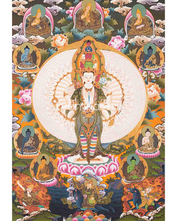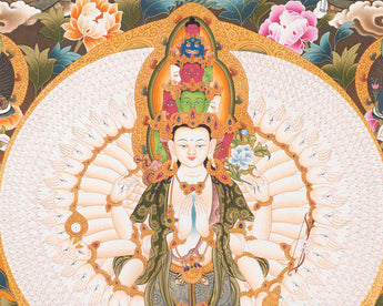 An Original Handmade Lokeshvara with 1000 Arms Thangka is a detailed Tibetan Buddhist painting that depicts Avalokitesvara, the Bodhisattva of Compassion, in his thousand-armed form. This form symbolizes his boundless compassion and ability to assist countless beings simultaneously. The central figure has eleven heads stacked in tiers, representing his awareness of suffering across all realms. His thousand arms, each with an eye in the palm, represent his omnipresent compassion and readiness to offer aid. Each arm extends outward, holding various symbolic objects indicating compassionate action and protection. The Thangka's intricate artistry showcases vibrant colors and fine lines, bringing the deity to life. Surrounded by smaller deities, elaborate floral patterns, and auspicious symbols, it is a powerful meditative tool and a sacred artwork embodying Tibetan Buddhism's profound teachings and aesthetics.