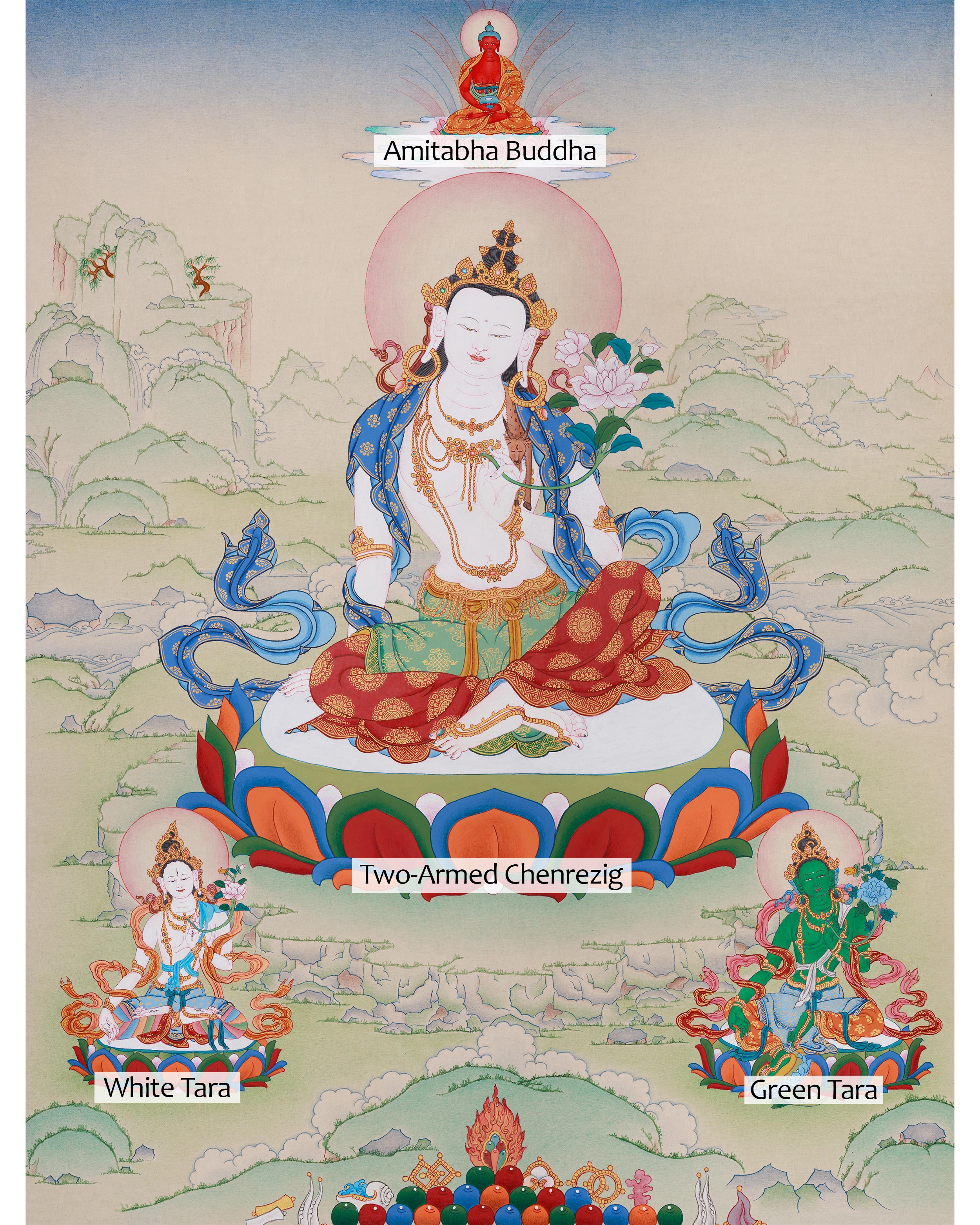 Sacred Chenrezig with White Tara and Green Tara | A Trio of Enlightened Blessings