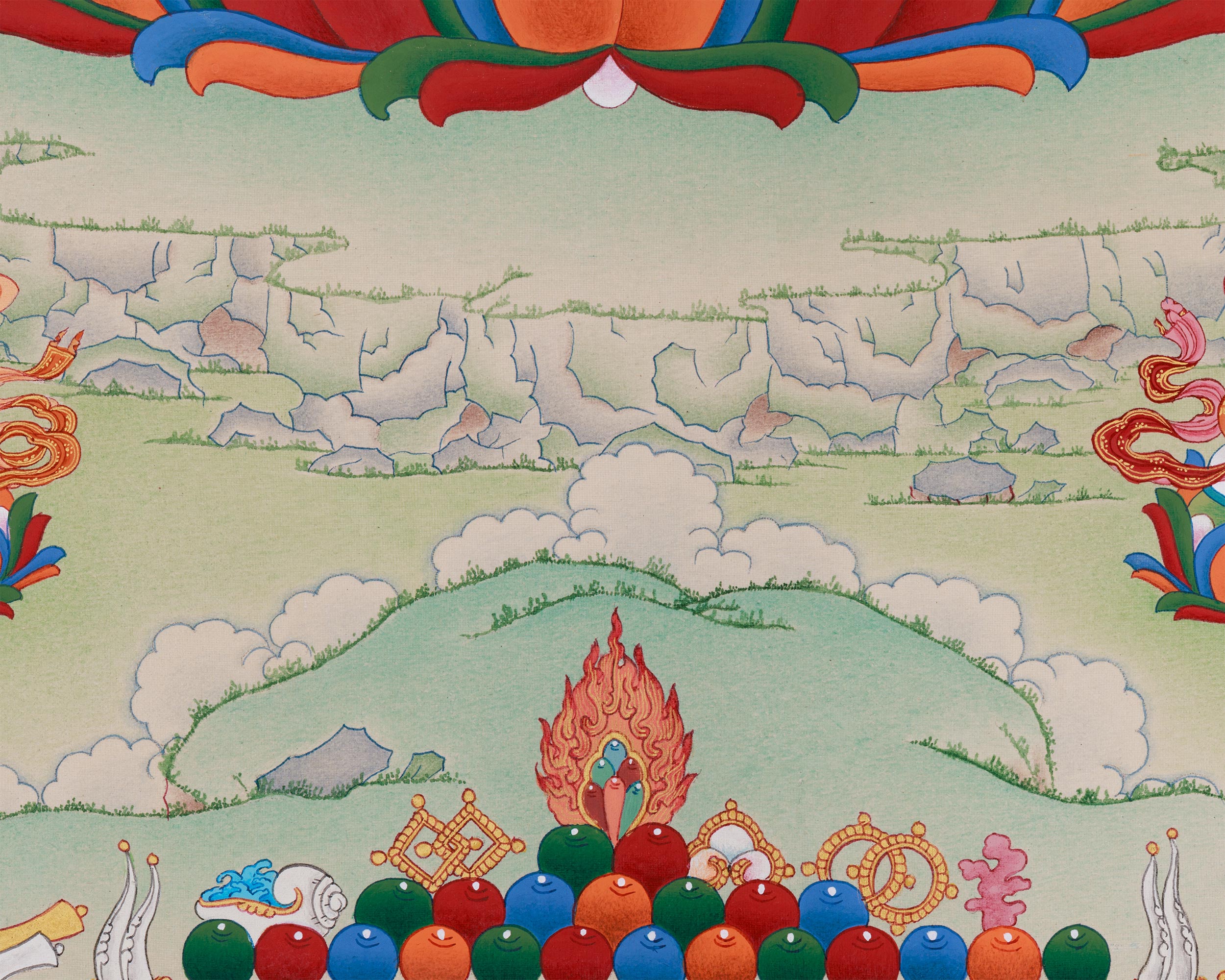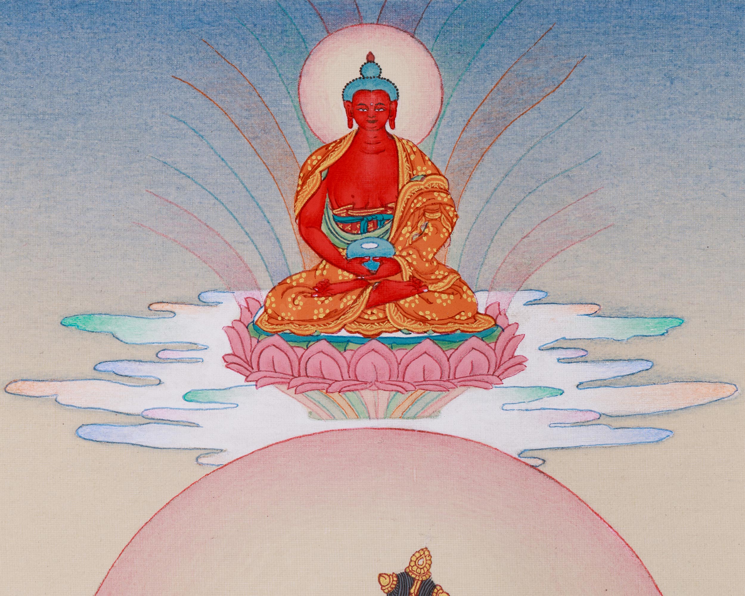 At the center is Two-Armed Chenrezig, also known as Avalokiteshvara, the Bodhisattva of Compassion. He sits on a lotus throne, with a serene expression that represents boundless mercy. In his left hand, he holds a lotus flower that symbolizes purity, while his right hand rests in a gesture of generosity. As the patron of Tibet, Chenrezig is deeply revered, and his mantra, Om Mani Padme Hum, is chanted worldwide to foster compassion and ease suffering. Above him sits Amitabha Buddha, his spiritual teacher, who radiates blessings and reinforces Chenrezig’s enlightened lineage.