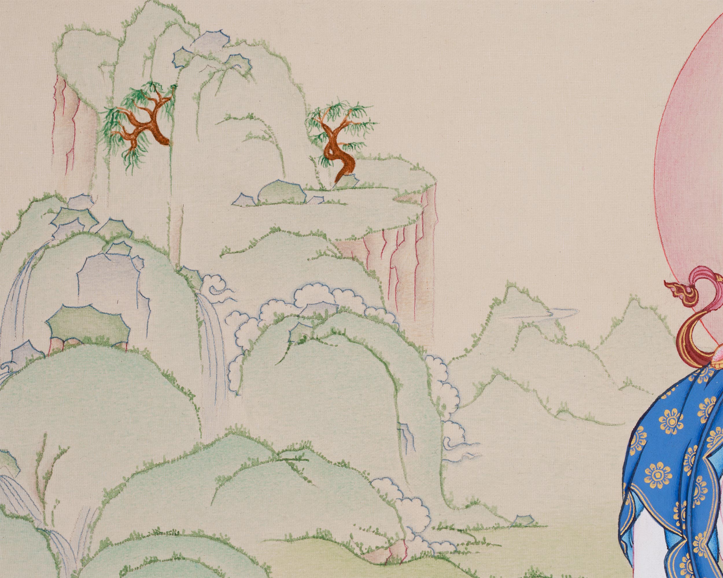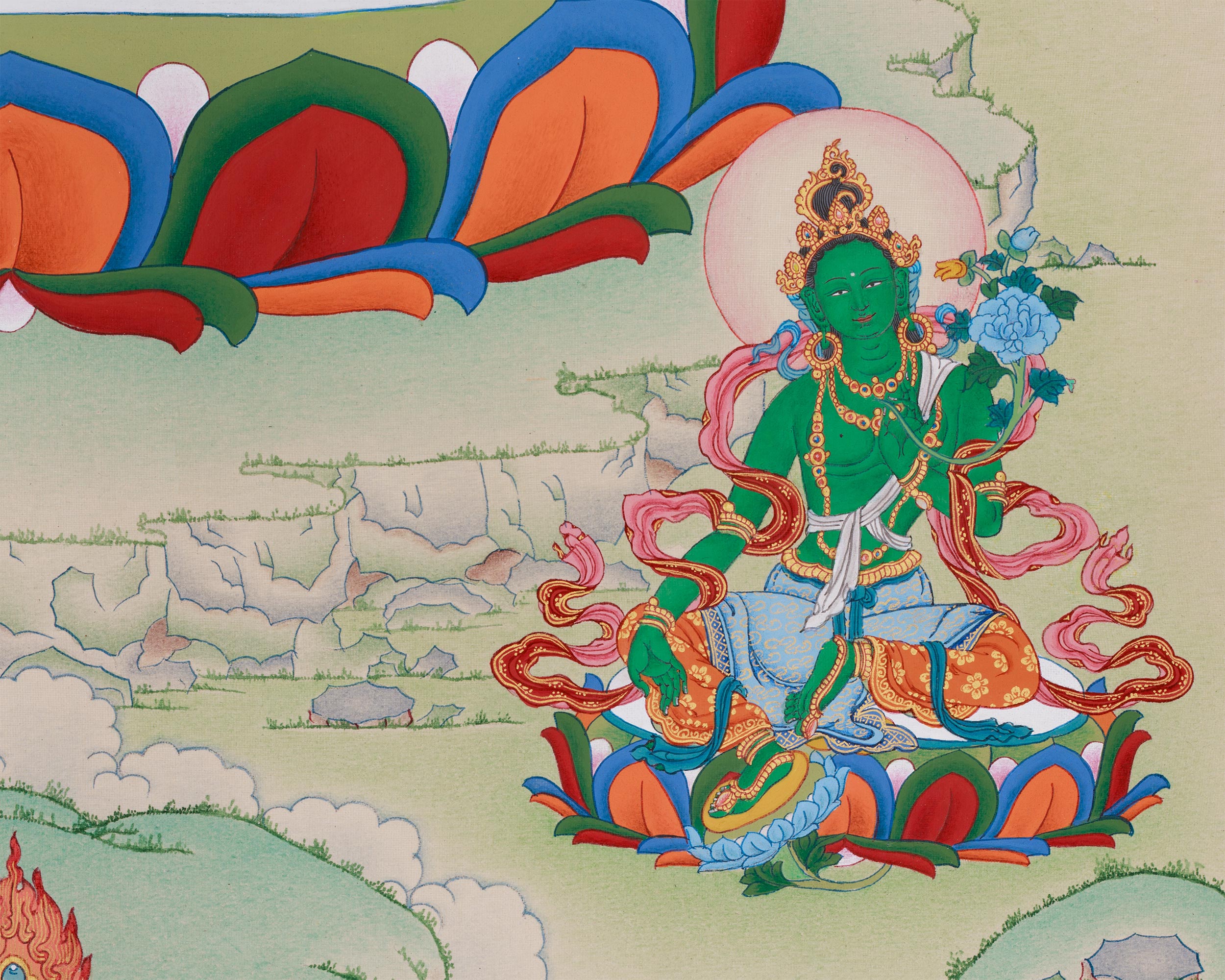 An extraordinary Chenrezig with White Tara and Green Tara Thangka, meticulously hand-painted on fine cotton canvas utilizing natural stone colors and embellished with genuine 24K gold. Executed in the distinguished Karma Gadri style, this masterpiece features refined details, subtle landscapes, and a luminous composition. The use of natural pigments ensures lasting vibrancy, while the gold accents highlight the sacred forms, giving the thangka an ethereal glow. Each brushstroke from our Enlightenment Studio embodies devotion and the centuries-old Tibetan artistic tradition.