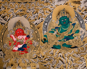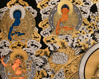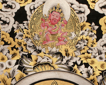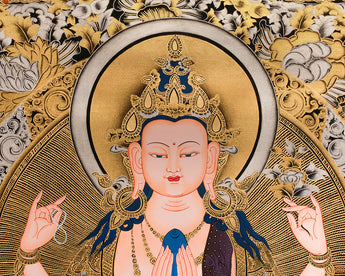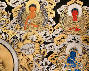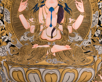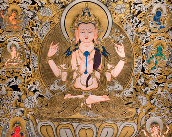 An exquisite and massive 24K gold Thangka showcases the revered 4-Armed Avalokiteshvara, the embodiment of compassion, surrounded by powerful deities from the Buddhist pantheon. With intricate craftsmanship and divine symbolism, this piece combines a harmonious collection of Buddhas, Bodhisattvas, and protective deities. Hand-painted with 24K gold and set against a striking black canvas, this Thangka is a true masterpiece, combining the divine presence of multiple Buddhist figures with the rich tradition of Tibetan artistry.